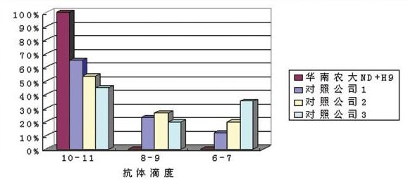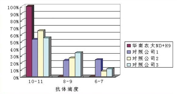 華南農(nóng)業(yè)大學(xué)獸醫(yī)學(xué)院針對(duì)近年國(guó)內(nèi)流行H9毒株和新城疫強(qiáng)毒作分析比較,挑選山東、河南、河北、廣西等 有代表性的禽流感H9N2病毒和新城疫強(qiáng)毒各近100株作為攻擊病毒,分別以上述病毒攻擊以用廣州市華南農(nóng)大生物藥品有限公司精品系列油苗一ND+H9和國(guó)內(nèi)其他廠家的疫苗免疫的試驗(yàn)雞,計(jì)算發(fā)病雞數(shù)量,統(tǒng)計(jì)不同疫苗之間的保護(hù)率,發(fā)現(xiàn)廣州市華南農(nóng)大生物藥品有限公司生產(chǎn)的精品系列油苗一ND+H9對(duì)上述攻擊野毒都有較好的保護(hù)作用。