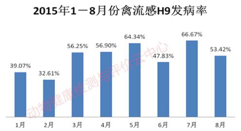 進(jìn)入2015年禽流感H9的發(fā)病率一路飆升,雖然8月份禽流感發(fā)病率較7月份有所下降,但發(fā)病率依然占據(jù)很大的比例。同時根據(jù)檢測云中心對臨床數(shù)據(jù)的統(tǒng)計(jì)分析發(fā)現(xiàn),第一雞群感染禽流感H9后,疾病所帶來的損失加大,如平均死淘率升高,個別病例死淘率日可達(dá)到2%;產(chǎn)蛋率波動幅度較大,開產(chǎn)雞群產(chǎn)蛋率不上升,嚴(yán)重的產(chǎn)蛋率下降,高者可下降10%左右。第二、禽流感H9成為養(yǎng)殖場的隱性殺手,當(dāng)與其它疾病一起感染時,不易被診斷出來,如雞群長期腹瀉久治不愈,雖然臨床和剖檢看不到H9感染跡象的存在,當(dāng)用實(shí)驗(yàn)室檢測技術(shù)進(jìn)行檢測時就會發(fā)現(xiàn),腸炎久治不愈的原因與H9有很大的關(guān)系。第三由于禽流感H9持續(xù)感染的存在,有些雞群從環(huán)境中獲得了被動免疫,體內(nèi)的抗體水平、體質(zhì)和環(huán)境中的病毒攻擊力達(dá)到一定平衡,這樣的雞群沒有明顯的臨床癥狀,但當(dāng)雞群受到外界應(yīng)激時即平衡被打亂,極易發(fā)病,且治愈難度較大?;谝陨锨闆r對于禽流感H9的防控應(yīng)從免疫、管理、生物安全等方面入手,制定一個全方位的防控計(jì)劃。