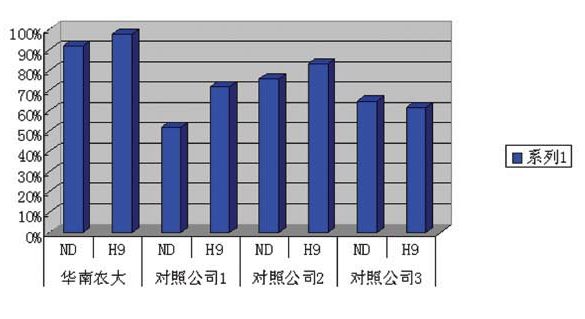 華南農(nóng)業(yè)大學(xué)獸醫(yī)學(xué)院針對(duì)近年國(guó)內(nèi)流行H9毒株和新城疫強(qiáng)毒作分析比較,挑選山東、河南、河北、廣西等 有代表性的禽流感H9N2病毒和新城疫強(qiáng)毒各近100株作為攻擊病毒,分別以上述病毒攻擊以用廣州市華南農(nóng)大生物藥品有限公司精品系列油苗一ND+H9和國(guó)內(nèi)其他廠家的疫苗免疫的試驗(yàn)雞,計(jì)算發(fā)病雞數(shù)量,統(tǒng)計(jì)不同疫苗之間的保護(hù)率,發(fā)現(xiàn)廣州市華南農(nóng)大生物藥品有限公司生產(chǎn)的精品系列油苗一ND+H9對(duì)上述攻擊野毒都有較好的保護(hù)作用。