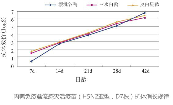 免疫后抗體水平高、持續(xù)時間長,快大型肉鴨、肉鵝經(jīng)一次免疫,平均抗體水平可達5log2以上;種鴨及種鵝經(jīng)3次免疫后,平均抗體水平可達10log2以上。