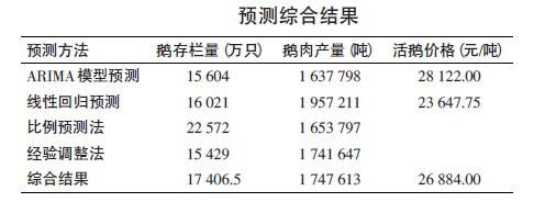 采用4種方法預(yù)測(cè)2014年鵝存欄量、鵝肉產(chǎn)量,以及2種方法預(yù)測(cè)2014年的活鵝價(jià)格(見(jiàn)表)。根據(jù)4種方法計(jì)算出的2014年鵝存欄量的平均值為17 406.5萬(wàn)只,鵝肉產(chǎn)量為1747 613噸,鵝價(jià)格為26 884元/噸。另外,參照揚(yáng)州大學(xué)徐琪根據(jù)我國(guó)鵝品種統(tǒng)計(jì)的鵝年存欄量21195萬(wàn)只,可以估算出2014 年我國(guó)鵝年存欄量將處在1.7億~2.1億只之間。因此,上述綜合預(yù)測(cè)結(jié)果是可信的。